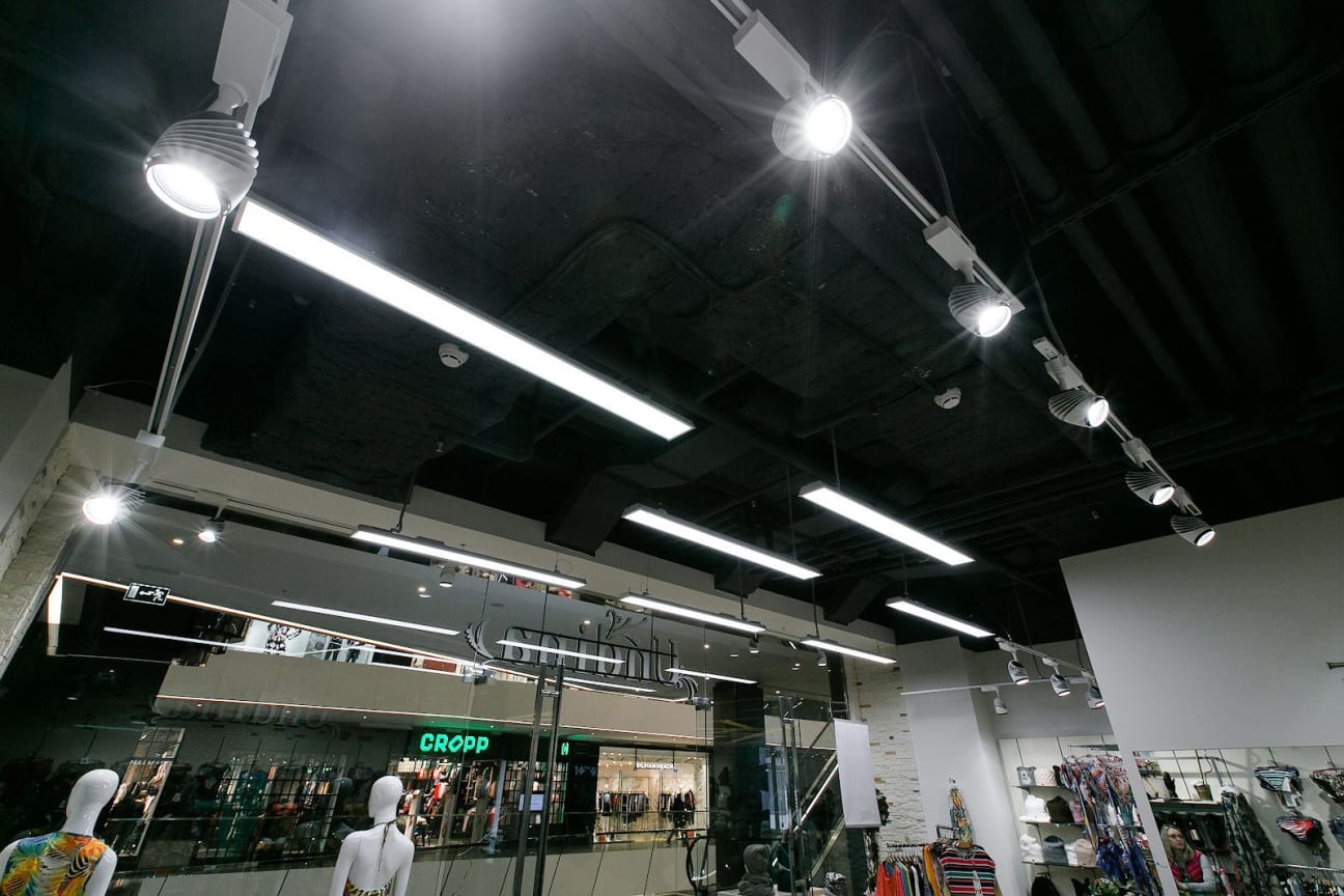 Выполнен светотехнический расчёт, учитывающий особенности торгового пространства, витрин и примерочных зон.