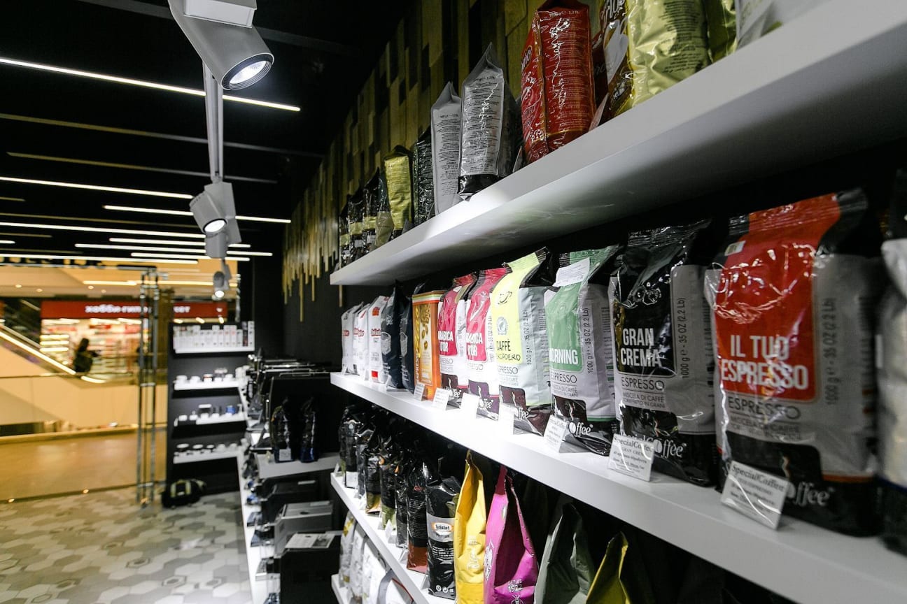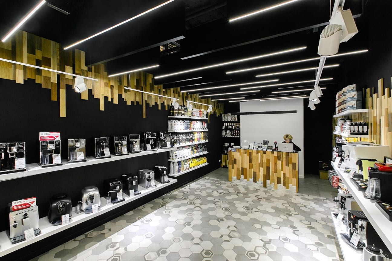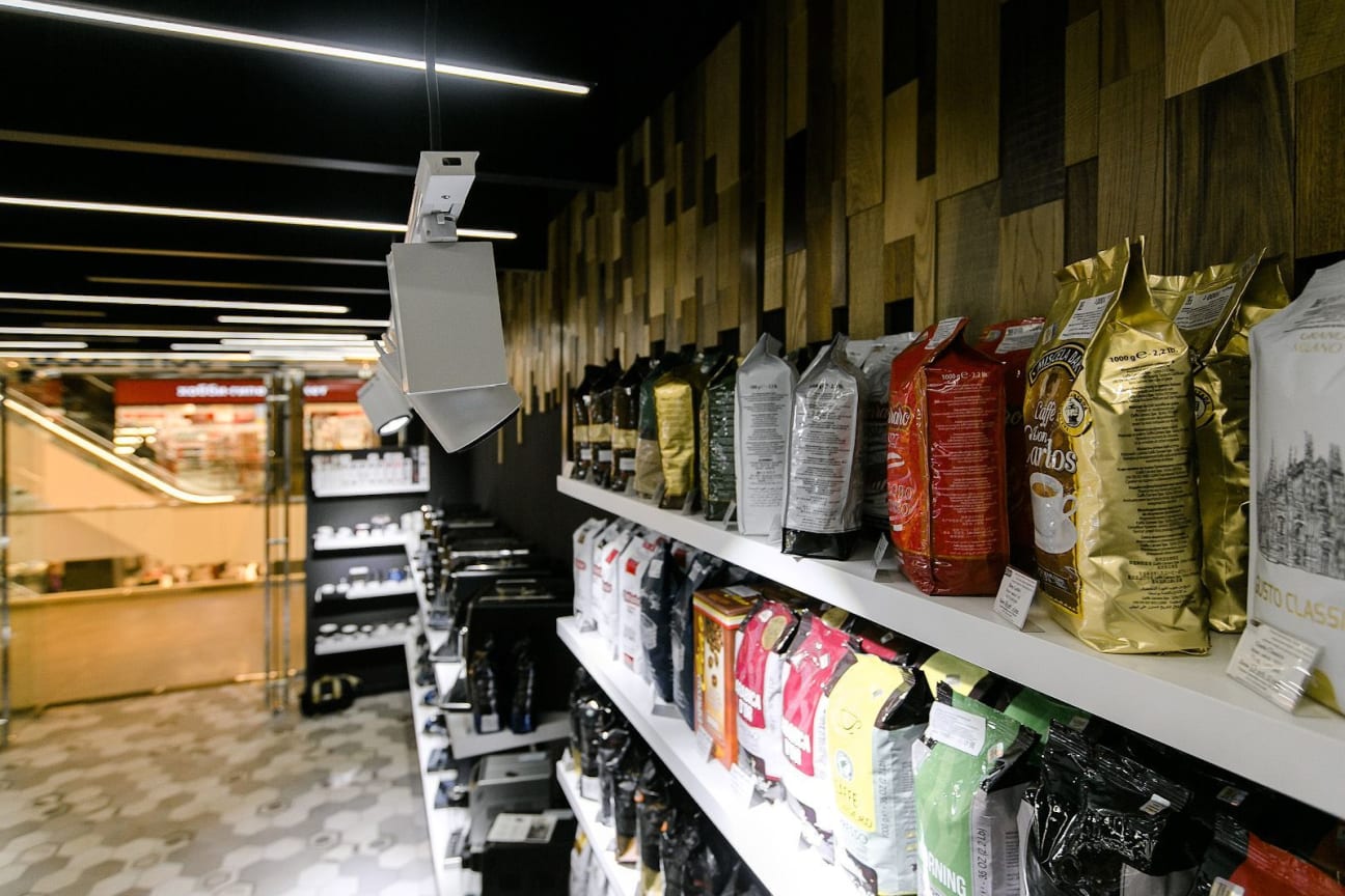 Реализовано освещение, которое акцентирует внимание на кофемашинах, витринах с продукцией и демонстрационных зонах.