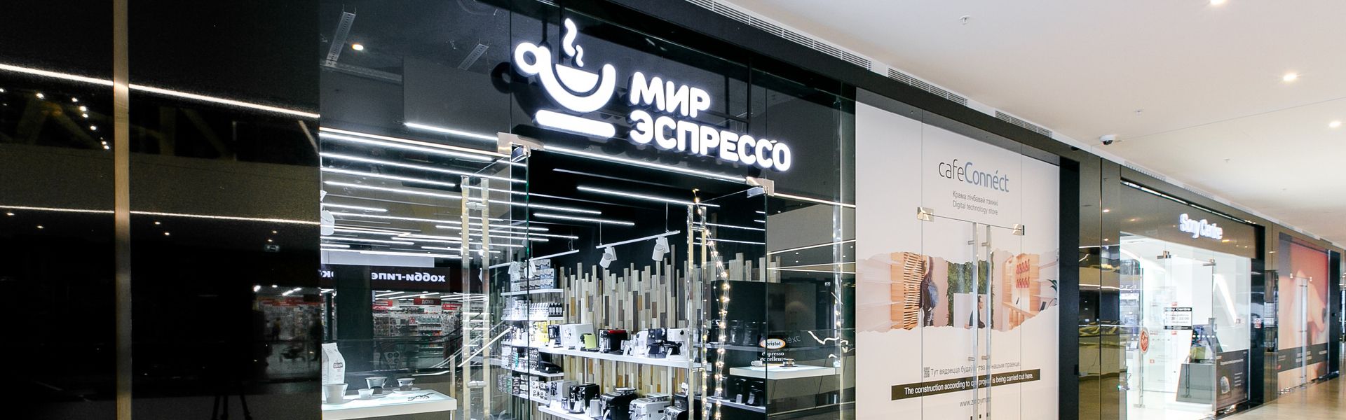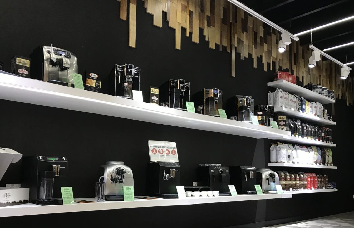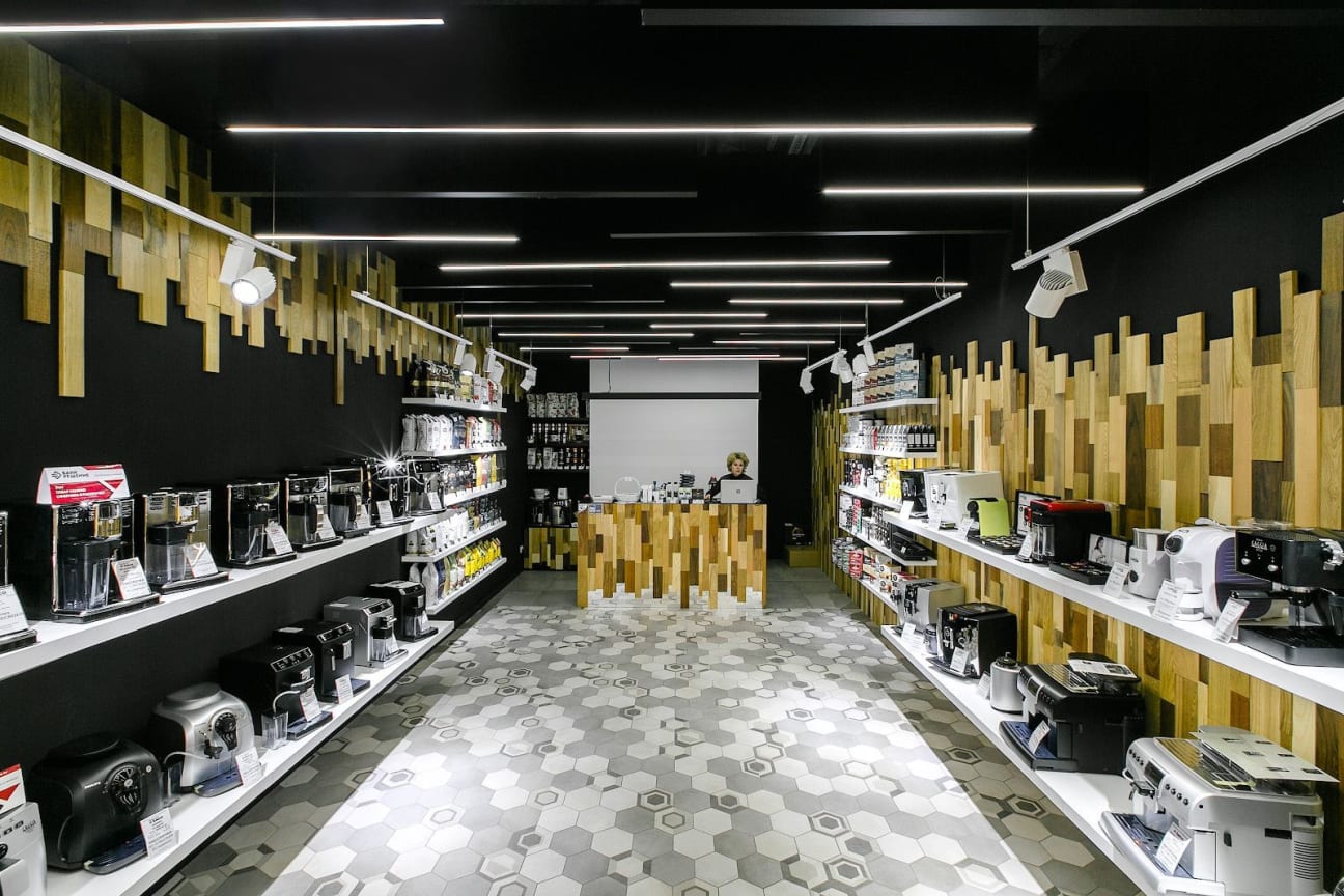Реализовано освещение, которое акцентирует внимание на кофемашинах, витринах с продукцией и демонстрационных зонах.